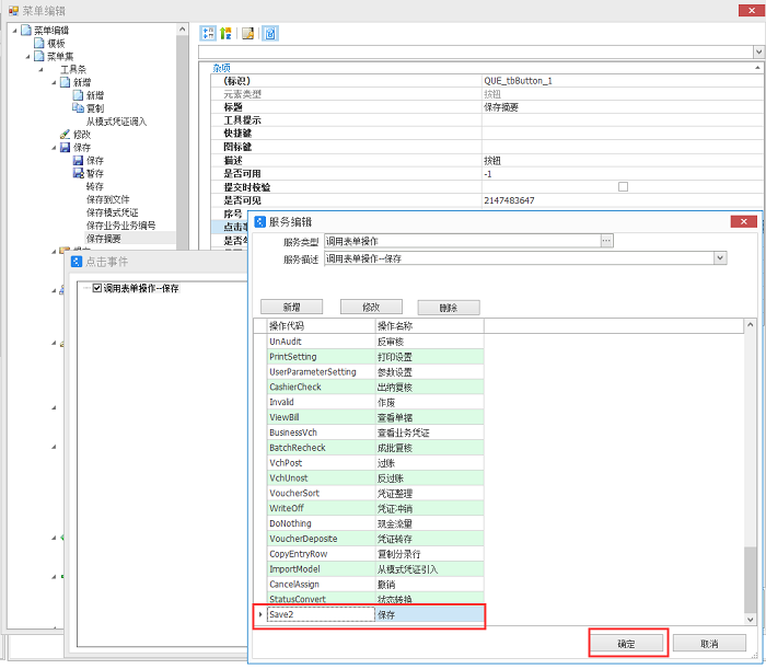 5. 在凭证【菜单集合】中找到【保存】单击右键添加一个【按钮】,修改成【保存摘要】,在点击事件中新增自定义一个保存操作(Save2),【保存摘要】菜单来调用自定义的保存操作(注意:不能直接调用标准的保存操作),全部配置完毕后保存;