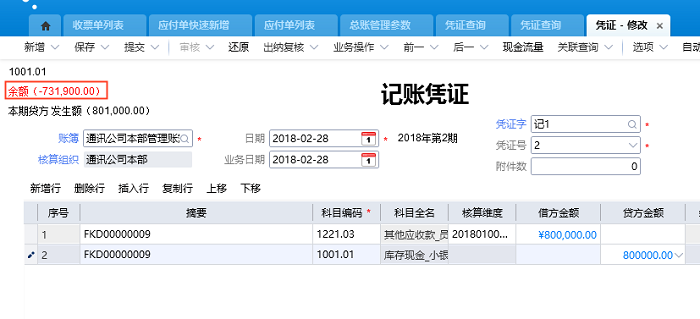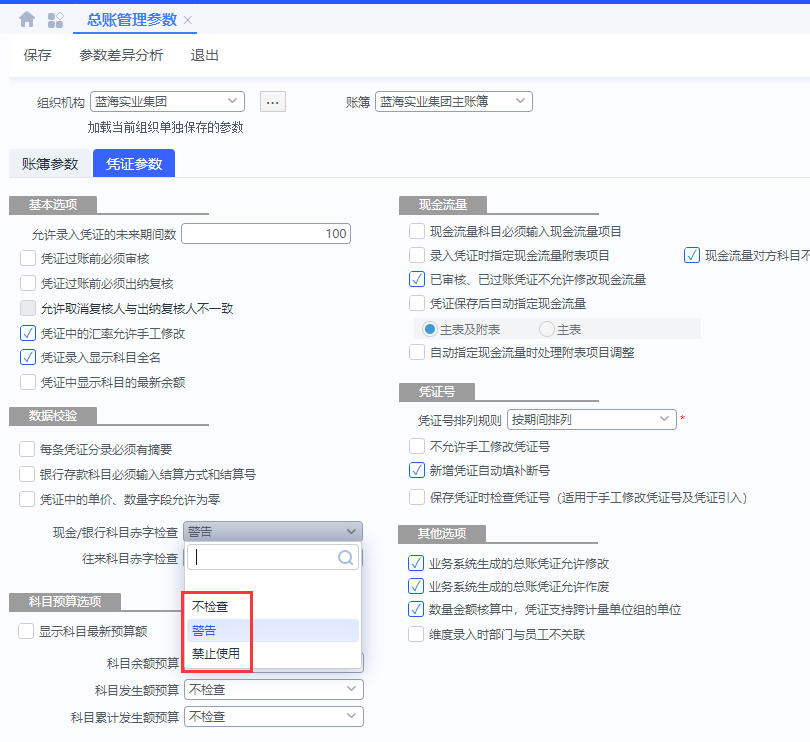 凭证录入为了控制现金科目、银行科目余额不能出现负数,此时可以通过总账管理参数【现金/银行科目赤字检查】的设置来控制,该参数有三个选项【不检查】、【警告】和【禁止使用】。