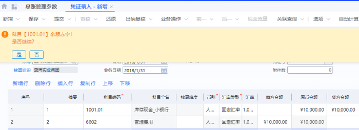 2、【现金/银行科目赤字检查】系统设置为“警告”,此时录入凭证时,当现金或银行科目余额出现负数时,此时系统会给予如下图所示提示,单击【是】可以继续保存,单击【否】凭证不保存。