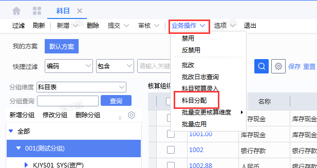 ②在科目列表界面,依次点击【业务操作】-【科目分配】;