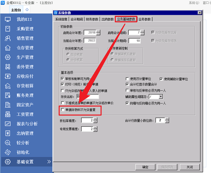 1、新增业务基础参数:单据体物料不允许重复,保存时进行检验