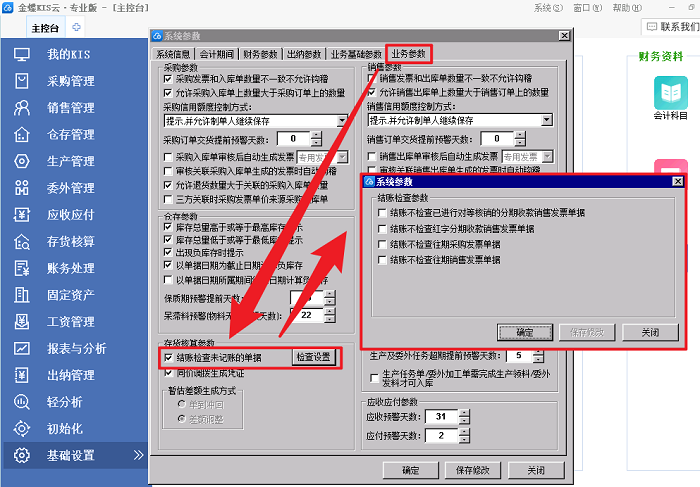 2、结账检查未记账单据,支持对部分业务场景单据选择不进行检查