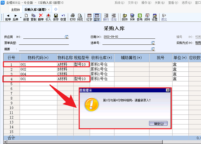 1、新建盘点单,录入仓库后,录入物料,物料的仓库可以更改并且保存
