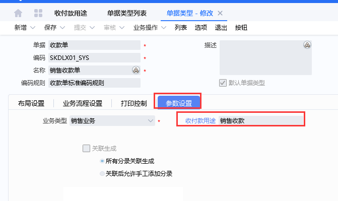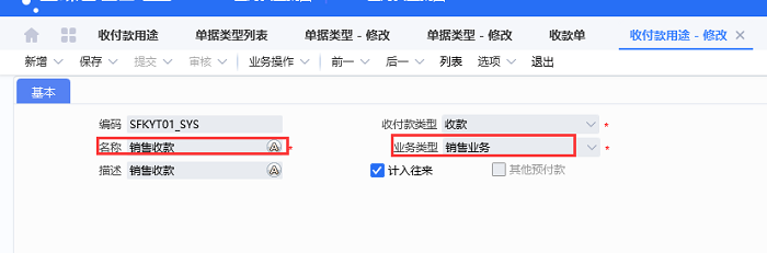 需要注意:单据类型和收付款用途的关联是根据业务类型区分,不同的业务类型关联不同的收付款用途,请勿随意更改单据类型的业务类型。