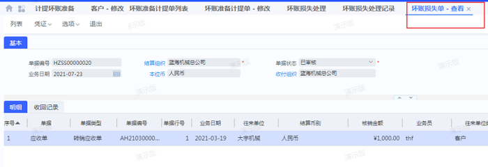 生成的坏账损失单: