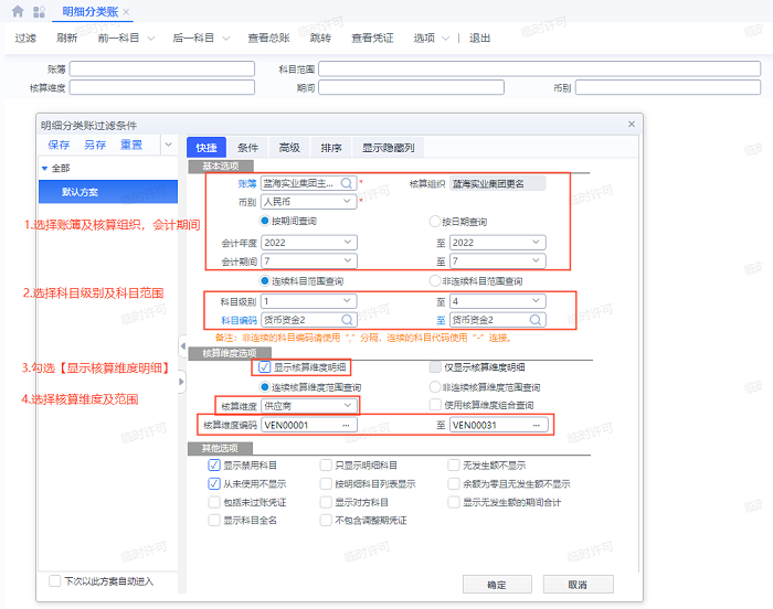 依次点开[财务会计]-[总账]-[明细分类账],根据实际需要维护过滤条件,选择对应的科目范围之后,勾选[显示核算维度明细],然后选择[核算维度编码],