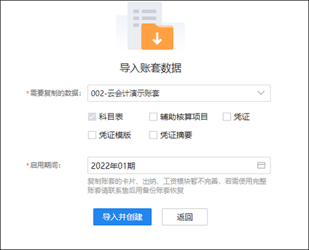 通过复制账套数据功能,可以复制同个会计服务下其他账套的科目表与凭证等数据。