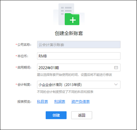 当您开始使用本系统时,您需要对本系统所使用的记账本位币、启用期间及会计制度进行设置,一经设置,创建账套后本位币和启用期间不能再变更。因此在启用前,可以预览不同会计制度下的科目表、利润表和资产负债表,按照公司的实际要求对各项进行设置。