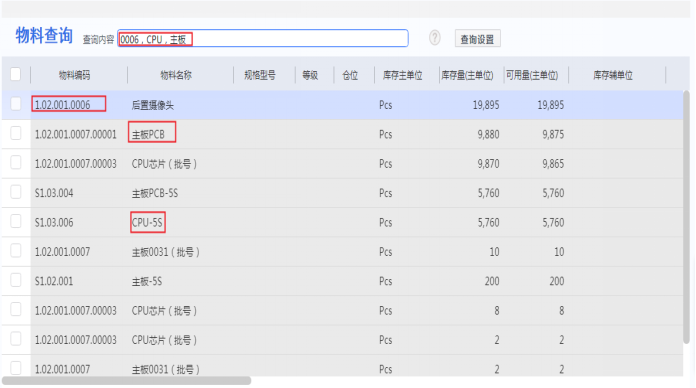 用户可以录入多个不同过滤条件,通过“,”分隔,进行批量物料检索,减少重复查询,提升查询效率。