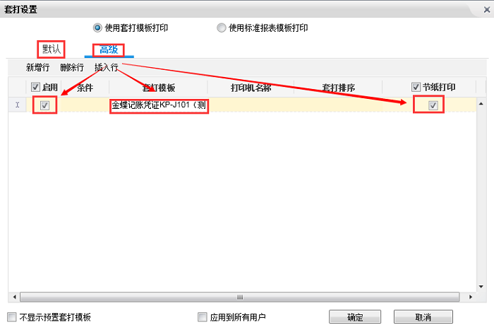 2、除了在BOS凭证模板【页面设置】中需要勾选“纵向节纸打印”,还需要在凭证查询界面【选项】下【套打设置】高级页签里勾选“启用”和“节纸打印”,此时模板才能生效。