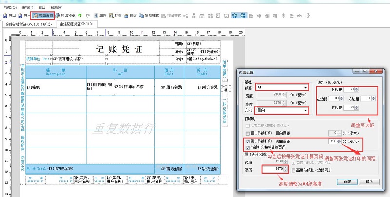 1、BOS凭证模板【页面设置】中,“纵向节纸打印”后面的“纵向间距”可以调整A4纸上两张凭证的间距 ;