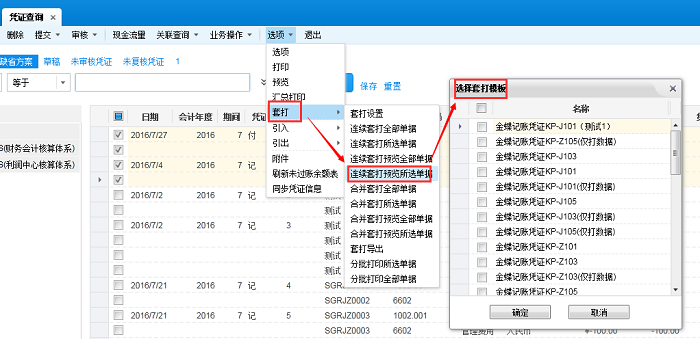 3、如果在凭证查询页面点击【连续套打预览所选单据】弹出对话框要求重新选择套打模板(如图-3),是因为勾选了【选项】下的参数“套打显示选择模板界面”(如图-4),此时若重新选择了模板,可能会使节纸打印不生效,导致一张A4纸只能打印一张凭证,取消勾选此参数即可。