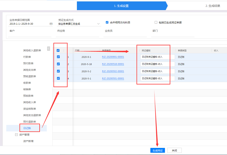 依次点击[账务处理]-[生成凭证],选择[资金管理]-[日记账],勾选需要生成凭证的日记账,并且选择好凭证模板,点下方的生成凭证。