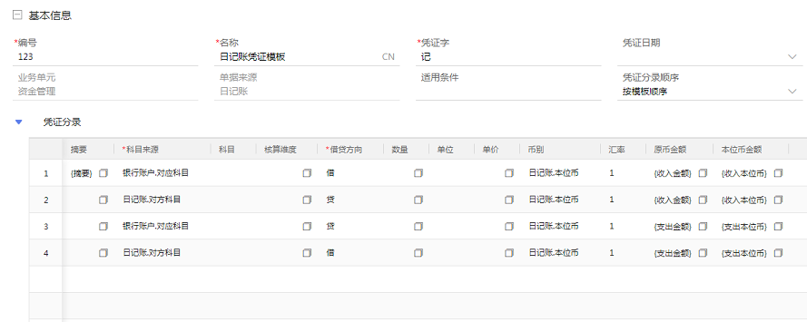 日记账的凭证模板在[账务处理]-[业务凭证模板]选择“资金管理”-“日记账”中设置,可参考如下截图的模板设置。