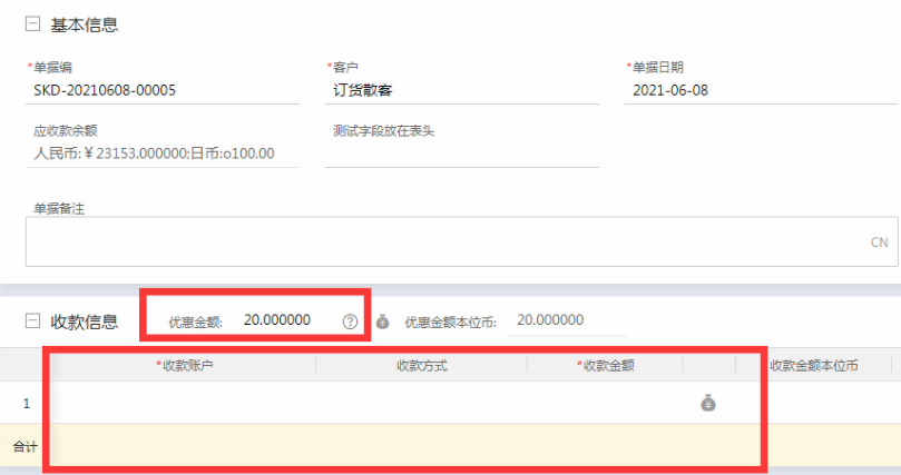 选择客户后收款信息位置为空,填写优惠金额,选择对应的销货出库单或者期初应收单保存。