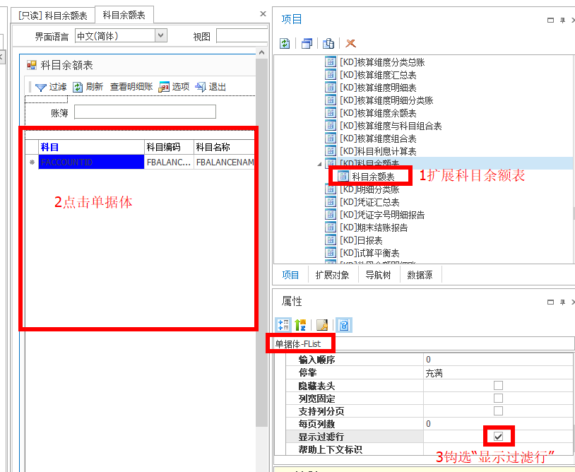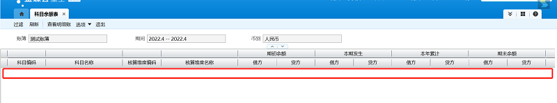 BOS扩展科目余额表,在单据体钩选“显示过滤行”即可