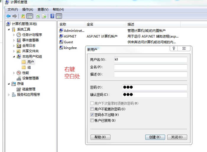 3、右键右边框的空白处,新建用户,注意勾选密码用不过期。点击创建。