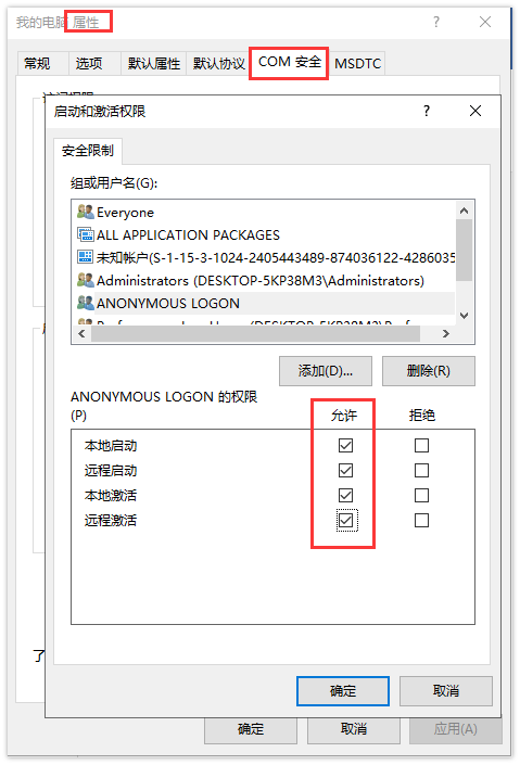 2、依次展开“组件服务”-“计算机”-“我的电脑”,鼠标右键“我的电脑”选择“属性”,切换到“COM安全”,分别在访问权限和启动和激活权限下的“编辑限制…”中选择Everyone和ANONYMOUS LOGON用户,勾选所有本地和远程的允许复选框: