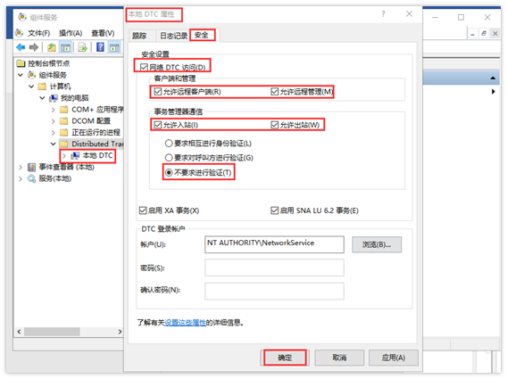 3、切换到“安全”选项卡,勾选“网络DTC访问”、“允许远程客户端”、“允许远程管理”、“允许入站”、“允许出站”、“不要求进行验证”,确定保存即可。如图: