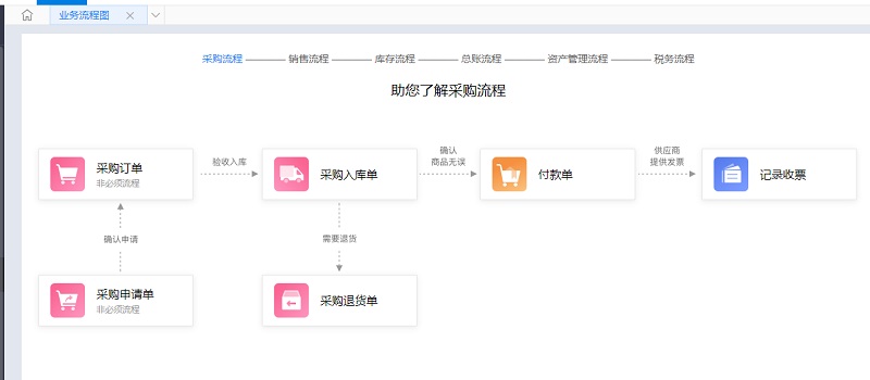 采购流程:点击主页面右上角的【帮助中心】-【业务流程图】打开即可看到采购的业务流程。