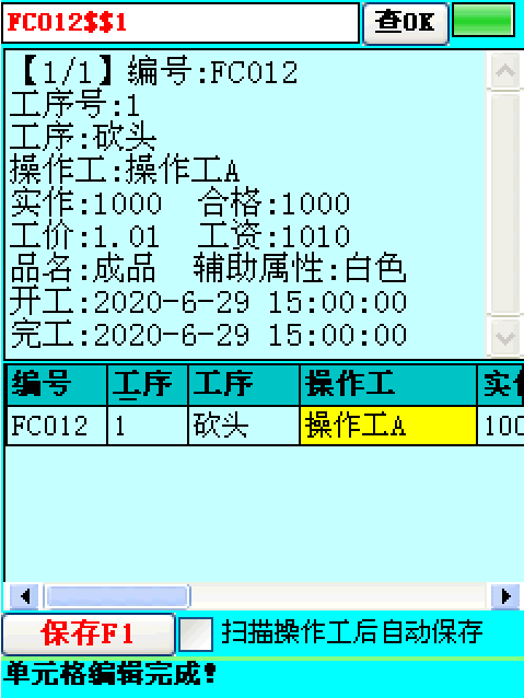 4) 如果需要对实作数量,合格数量,开工时间,完工时间进行修改,可以移动光标到相应需要修改的单元格,按【OK键】进行修改,修改后,按【OK键】进行确认。
