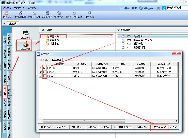 3.在合并账务对话框中,在“任务列表”页签,选择对应的子公司,再单击【开始合并】按钮即可。