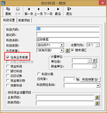 3、在[往来对账资料]界面可以看到该往来科目之前的发生记录(PS.科目需要初始化数据录入之前勾选上[往来业务核算],不勾选则往来业务选项是不可点击的状态)。