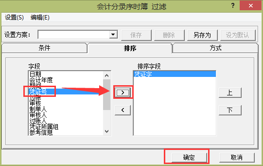 2、过滤条件点击[排序]页签,字段选择凭证字、凭证号,右选到排序字段。最后点击确定即可。