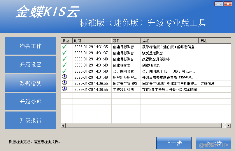 升级完成后,系统会直接根据升级结果,生成升级报告。请详细阅读升级报告,报告中会给出详细升级成功数据说明。如果遇到账套数据异常,无法正常升级,也会在报告中给出详细说明。点击查看详细,同样能查询到详细的日志说明。