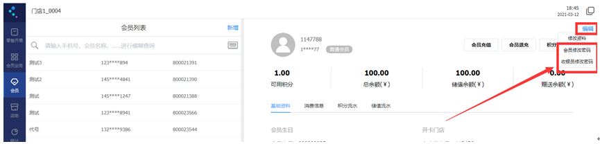 ③在POS端修改密码有两种方式,会员修改密码和收银员修改密码。这两功能相同点是,都是收银员给会员修改密码。不同点在于,收银员修改密码无需会员验证,一般应用在商家与顾客相互信任的场景。而会员修改密码需会员验证,保证密码安全。