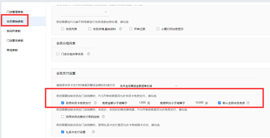 方式一:零售后台中,打开【门店管理】—【参数设置】—【会员营销参数】—【会员支付设置】——选择“启用会员卡免密支付”,设置对应的免密额度,点击保存。