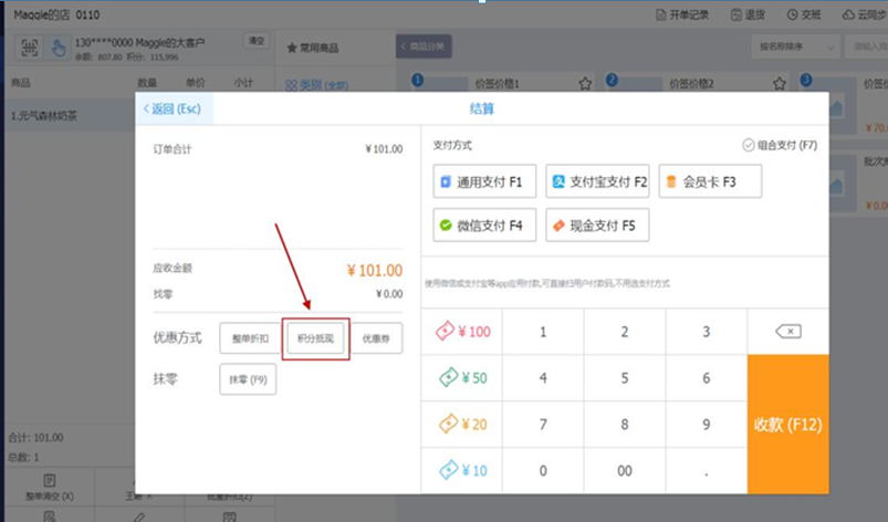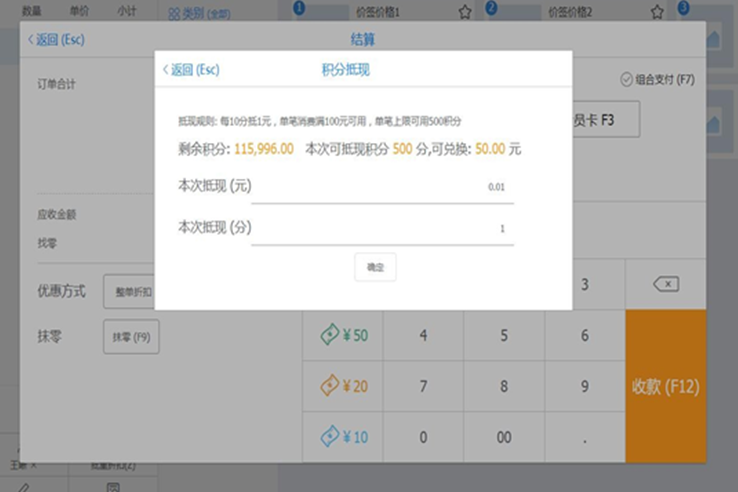 【说明】:因积分为整数,当录入本次抵现金额后折算的积分不为整数时,默认向上取整。如下图所示,积分规则为每10分抵1元,此时,录入本次抵现金额0.01元,折算后的抵现积分应为0.1,向上取整后为1,因此,本单需要消耗的积分数量为1。