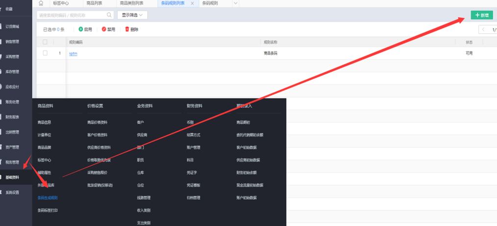 (1)单击【基础资料】→【商品资料】→【条码生成规则】→“新增”,进入条码生成规则界面