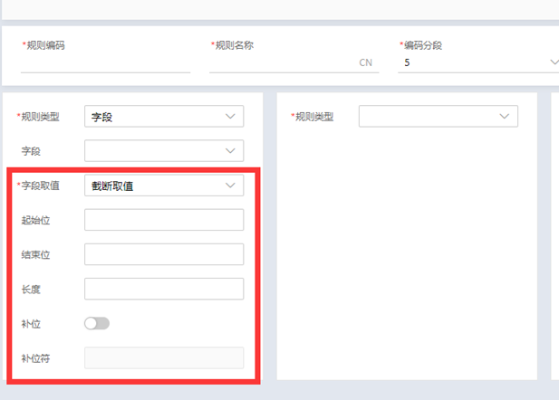 截断取值:当截断取值时,若长度设为2(小于ABC的长度3时)或录入起始位结束位(如起始位1,结束位2)自动计算的长度为2,则根据起始位结束位(如起始位1结束位2)取AB作为业务字段这一编码段;若长度设为4(大于ABC的长度3时)录入起始位结束位(如起始位1结束位4)自动计算的长度为4,补位字符0,则取ABC0作为业务字段这一编码段