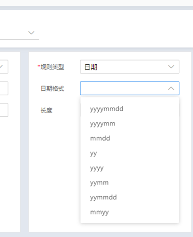 (5)规则类型-日期:当选择规则类型为“日期”,则格式中可下拉选择yyyymmdd、yyyymm、mmdd;默认yyyymmdd。