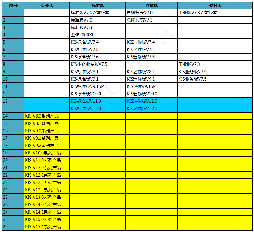 黄色背景表格中的版本直接通过金蝶KIS云·专业版V16.0账套管理中的升级功能升级。