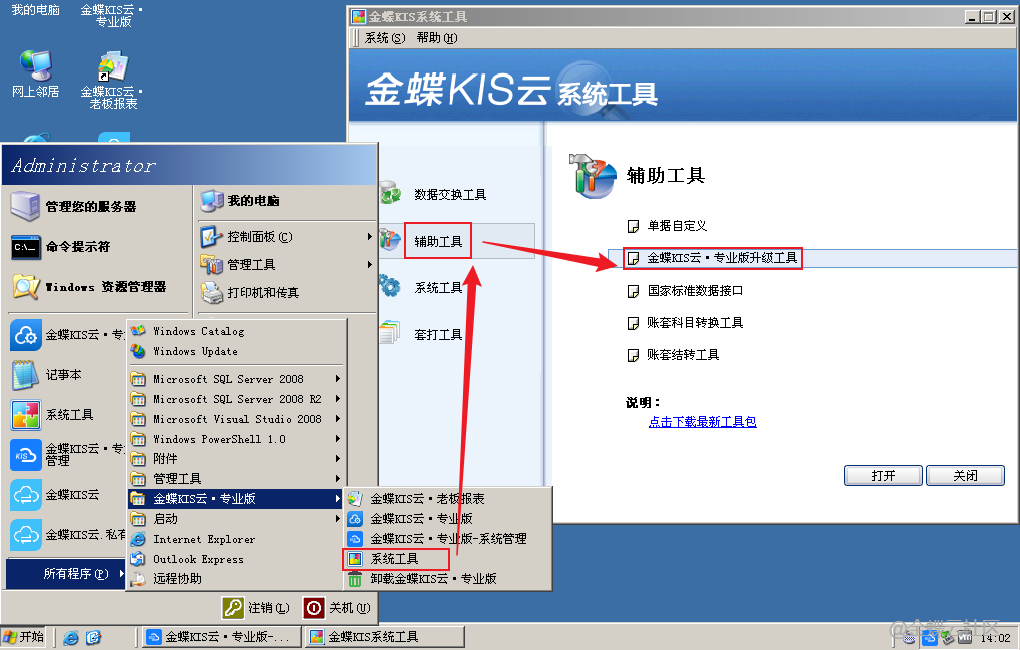在【金蝶KIS系统工具】界面,选择【金蝶KIS云·专业版升级工具】后,会出现【点击下载最新工具包】字段。点击后,在服务器连网的情况下,可以下载到最新的升级工具包。建议您在需要升级时,下载最新工具包解压缩后使用。