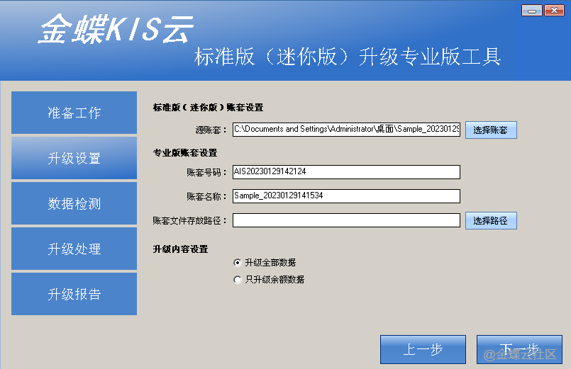 【金蝶KIS云标准版(迷你版)升级专业版工具】--【升级设置】页签字段说明: