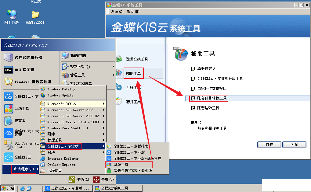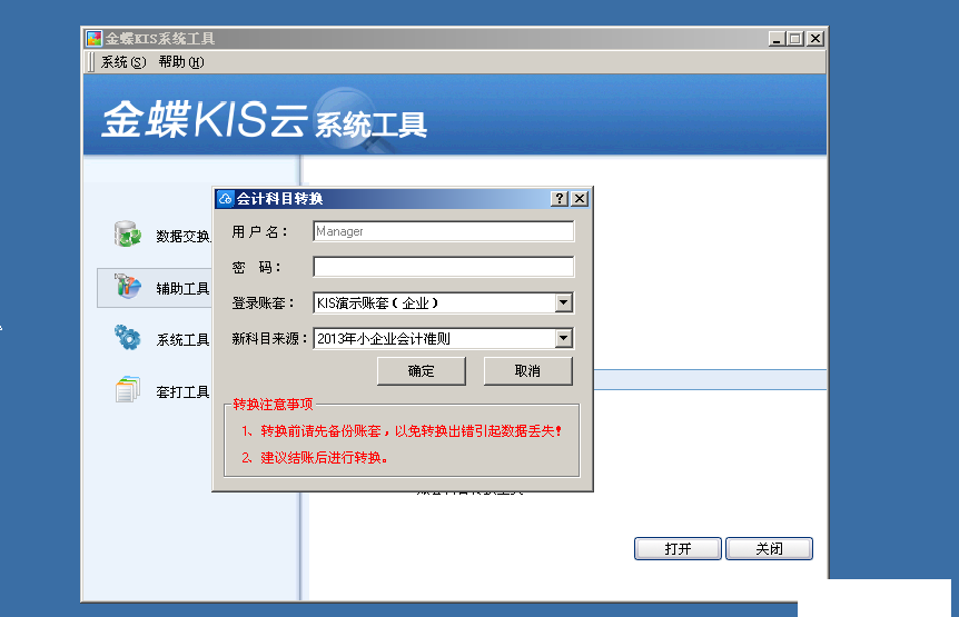 电脑选择【开始】→【程序】→【金蝶KIS云·专业版】→【系统工具】→【辅助工具】→【账套科目转换工具】,系统打开【会计科目转换】界面;