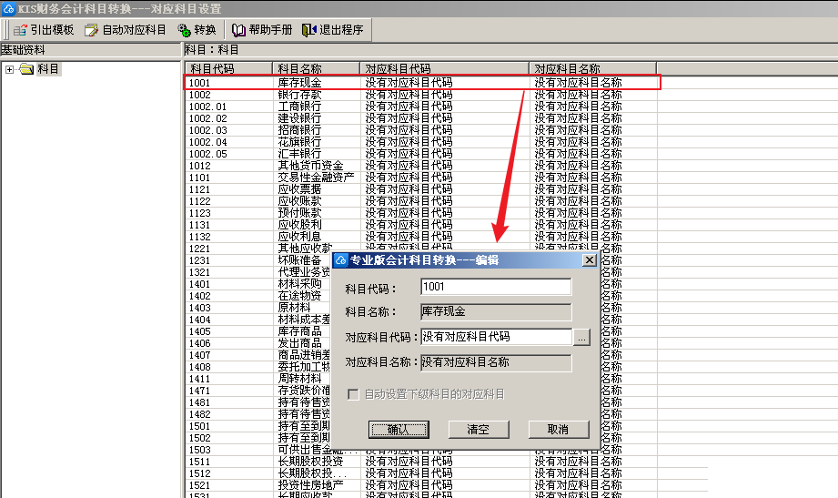 在【KIS财务会计科目转换---对应科目设置】界面中,选择右侧科目列表,双击科目进入对应科目的【专业版会计科目转换---编辑】页面进行设置;