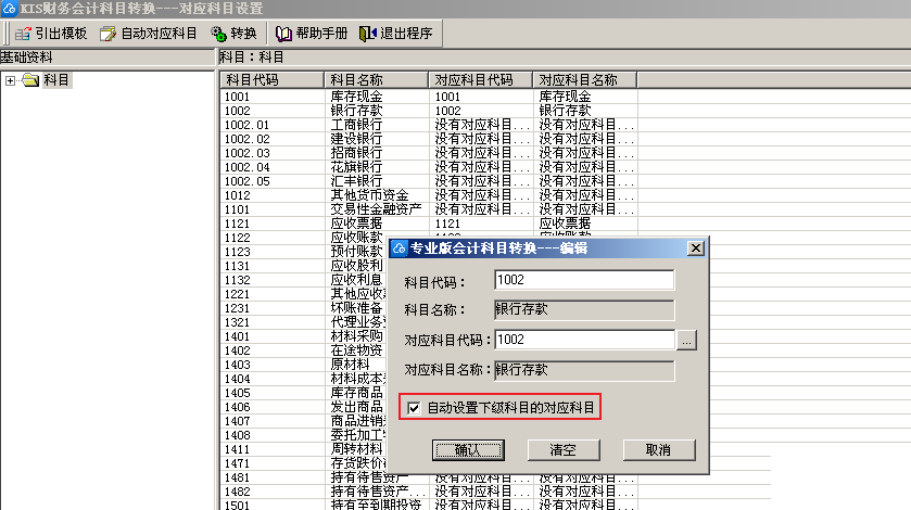 点击工具栏【自动对应科目】按钮,系统将根据科目名称一致的原则自动设置对应科目。