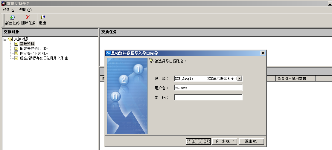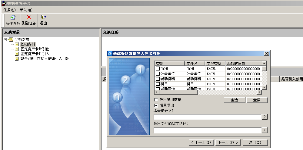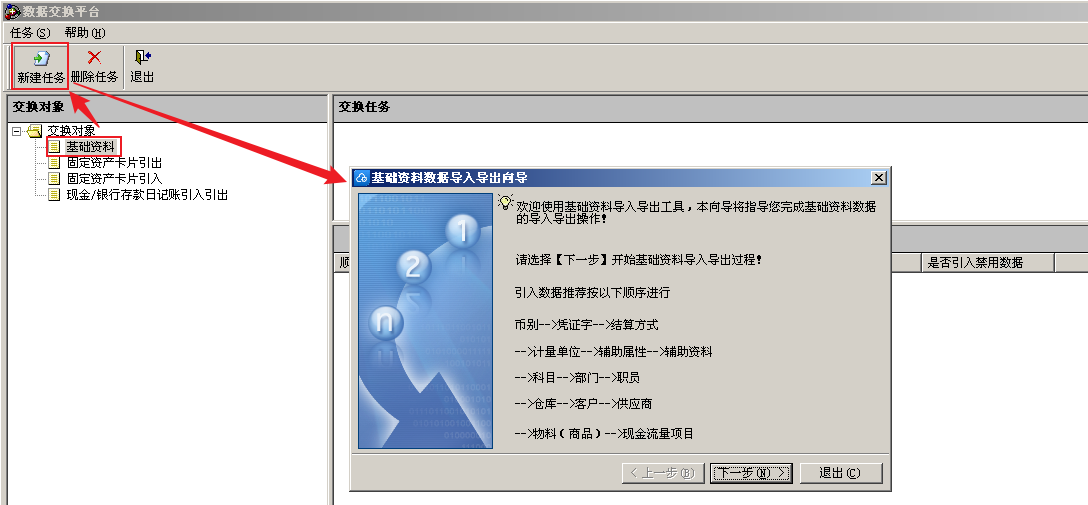 在【数据交换平台】界面中,选择【基础资料】后,单击【新建任务】,系统调出【基础资料数据导入导出向导】窗口;