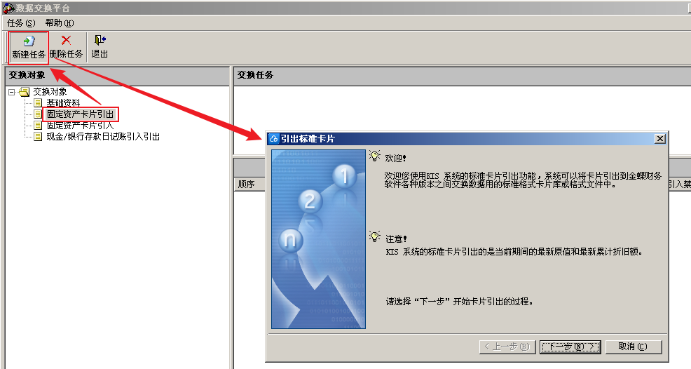 在【数据交换平台】界面中,选择【固定资产卡片引出】后,点击【新建任务】,系统调出【引出标准卡片】窗口,确认注意事项后,点击【下一步】;