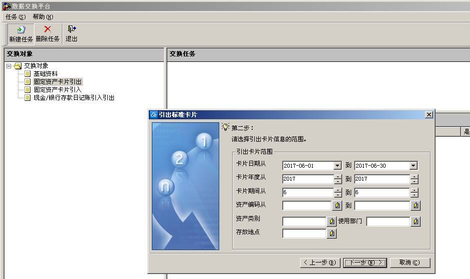 选择所需引出卡片的范围,包括:卡片日期范围、资产编码范围、资产类别、使用部门、存放地点等信息,以准确过滤要引出的卡片资料,如果不进行设置,系统将自动把所有卡片资料引出。设置完成后,点击【下一步】;