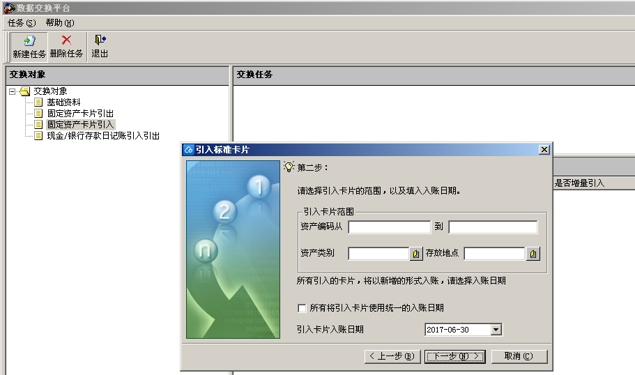 在【数据交换平台】界面中,选择【固定资产卡片引入】后,点击【新建任务】,系统调出【引入标准卡片】窗口,确认注意事项后,点击【下一步】;