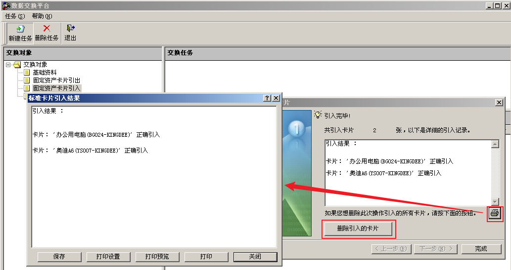 引入完成后,将给出引入报告,在【引入标准卡片】界面的【打印】按钮,打印引入报告。如果不想保存本次引入的卡片,单击【删除引入的卡片】,系统将删除此次操作引入的所有卡片;