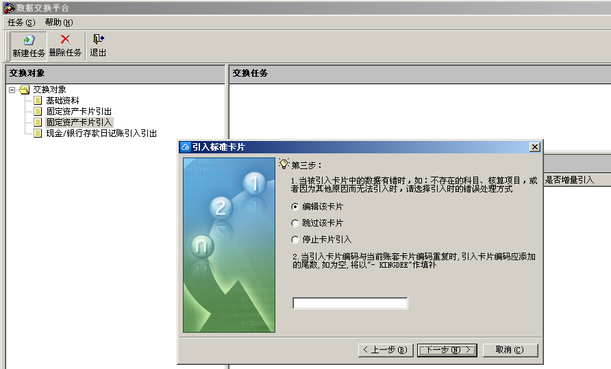 选择卡片引入过程中,发生错误或资产编码重复时的处理方式。对于引入过程中发生错误的情况,系统提供【编辑该卡片】、【跳过该卡片】以及【停止卡片引入】的处理方式;此外,在卡片引入过程中,可能会出现资产编码重复,系统会在重复的编码末尾加上后缀进行处理,用户也可以自定义后缀,系统默认以后缀“-KINGDEE”作为填补。用户选择完成后,单击【下一步】