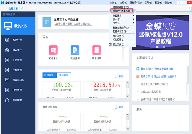 进入一个KIS云·标准/迷你版账套,点击右上角[文件]菜单—[升级历史版本账套],在弹窗里,从S盘中选择需要升级/恢复的账套文件。