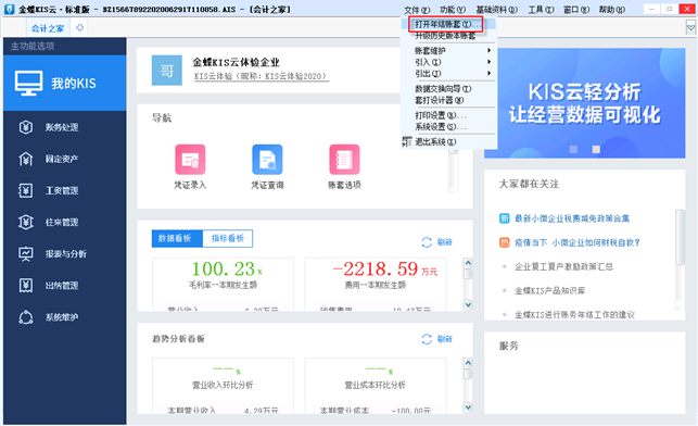 若升级/恢复的账套为AIY年结账套,升级年结账套后,需要在[文件]菜单-[打开年结账套]中进行维护及查看。
