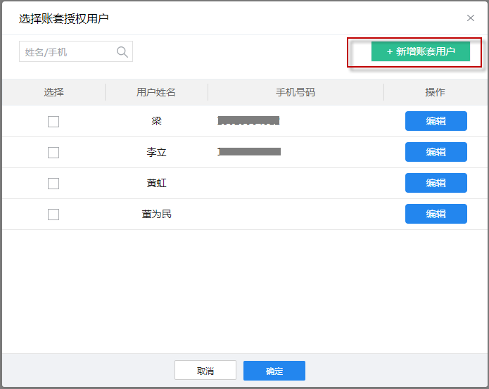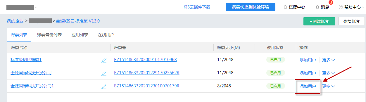 步骤一:在账套列表,选择需要绑定用户的账套点击添加用户